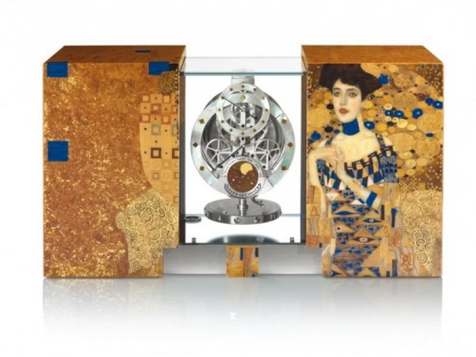 Футляр настольных часов украшает «Портрет Адели Блох-Бауэр» работы Густава Климта, выполненный из более чем 1200 кусочков дерева