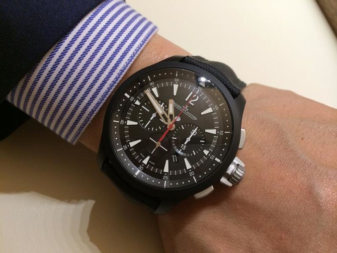 Новинка мужских часов от Jaeger LeCoultre, разработанных мануфактурой в 2015 году, представлены ограниченным тиражом - 500 экземпляров. Корпус часов, диаметром 46 миллиметров, произведен из керамики. Циферблат защищен сапфировым стеклом. В комплекте - нейлоновый ремешок с классической пряжкой. Особенности модели - индикация даты и времени второго часового пояса, а также функция хронографа. Водонепроницаемость корпуса - 100 метров. На циферблате указываются: часы, минуты, секунды, дата, GMT, счетчики хронографа. Толщина корпуса - 14.3 миллиметров. Индексы и стрелки покрыты люминесцентным составом.