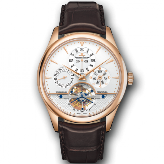 Референс 500242A. Механизм автоматический, Калибр JLC 987 . Размеры корпуса 42 мм. Корпус розовое золото 18к. Особенности Астрономические часы, Вечный календарь, Водостойкие, Турбийон. Функции часы, минуты, секунды, дата, день недели, месяц, год, фаза луны, цикл високосного года. Циферблат белый гильошированный. Запас хода 48 часов. Ремешок кожа аллигатора с золотой 18к вставкой, откидная застежка. Дополнительная информация водонепроницаемость 50 м.