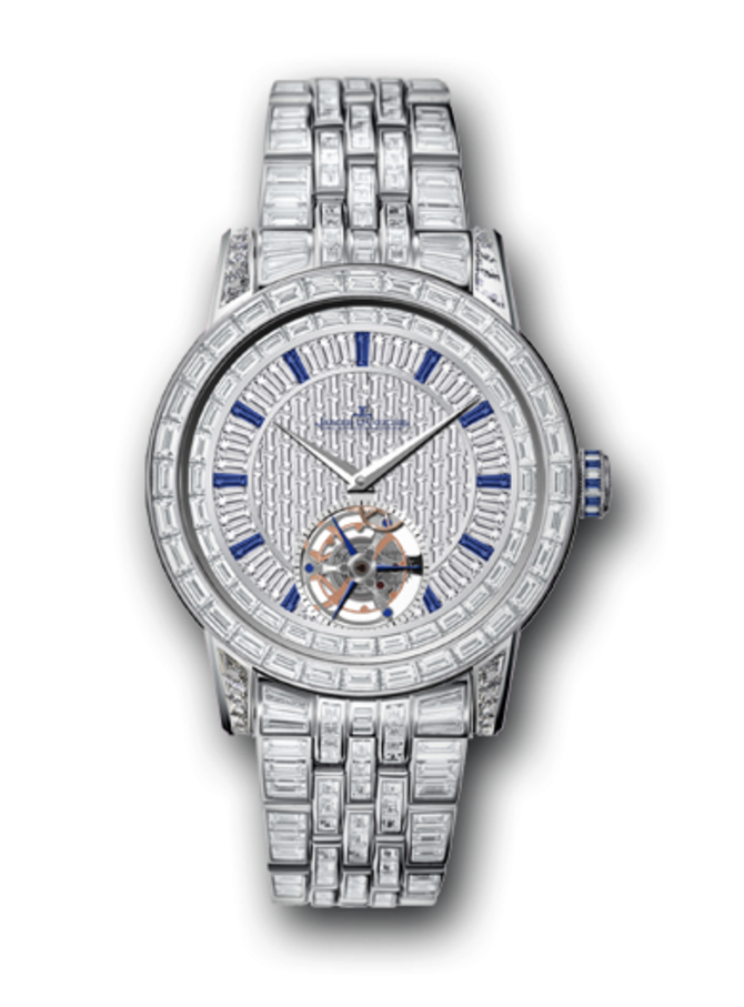 Модель часов "Master Grande Tradition Tourbillon Cylindrique" от Jaeger-LeCoultre имеет очень важную особенность - роскошное сочетание элегантных ювелирных изделий с высоким часовым искусством. Часы, полностью украшенные бриллиантами, имеют увлекательное усложнение: турбийон. Циферблат часов - это набор багетных бриллиантов и сапфиров. Корпус модели изготовлен из белого золота. Диаметр его - 42 мм. Автоматический механизм часов на 31 драгоценном камне, выполнен из 275 деталей, обладает запасом хода - 45 часов и балансовой частотой - 28 800 колебаний в час. Его высота - 6.50 мм. На циферблате отображаются часы, минуты, секунды и турбийон. Браслет часов из белого золота, полностью инкрустирован белыми багетными бриллиантами.