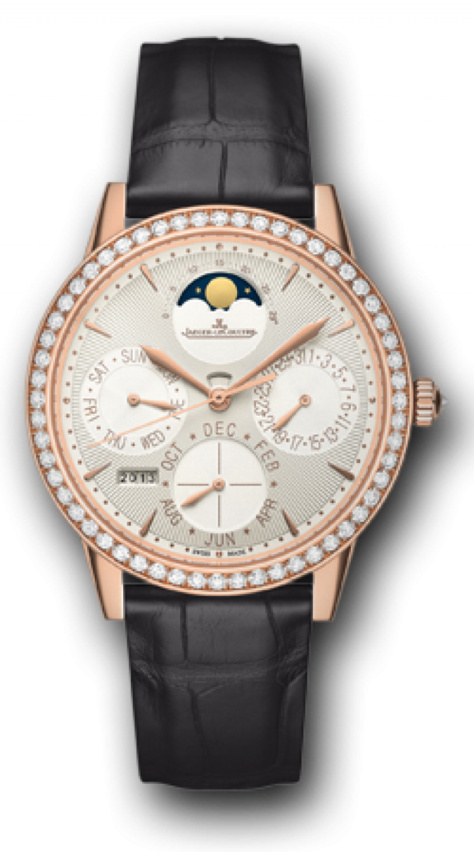 Модель швейцарских наручных часов Rendez-Vous Perpetual Calendar в корпусе из розового золота (диаметр - 37.5 мм, толщина - 9.5 мм) - это идеальное сочетание часовых традиций и элегантности. Часы обладают функцией вечного календаря, с указанием всего года четырьмя цифрами, и функцией индикации лунных фаз. Внутрь корпуса, обладающего 50-ти метровой водонепроницаемостью, помещен автоматический механизм (Jaeger-LeCoultre Calibre 868) на 46 драгоценных камнях, имеющий 38 часов запаса хода и 28 800 колебаний/час - балансовую частоту. Ремешок часов выполнен из кожи крокодила и наделен раскладывающейся золотой застежкой для фиксации часов на запястье своего владельца. Роскошный аккуратный циферблат тонко гильоширован вручную. С целью сделать часы еще красивее, для украшения бриллиантовой огранки мастера компании использовали 114 бриллиантов, тем самым придав модели более элегантный ювелирный вид.