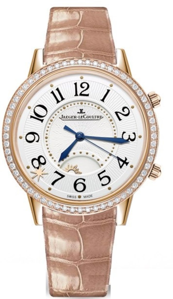 Швейцарская мануфактура Jaeger-LeCoultre, существующая еще с 1833 года, представляет наручные механические часы для женщин в золотом корпусе, безель которого украшен бриллиантами. На белом циферблате с гильошированием указываются часы, минуты, секунды, день/ночь. Накрыт циферблат стеклом из сапфира. Стрелки изготовлены из вороненой стали. Бежевый ремень из кожи аллигатора. Установленный механизм - Jaeger-LeCoultre 735 с автоподзаводом, запасом хода 40 часов и встроенным будильником. Общий вес бриллиантов - 1.33 карата, количество - 56.