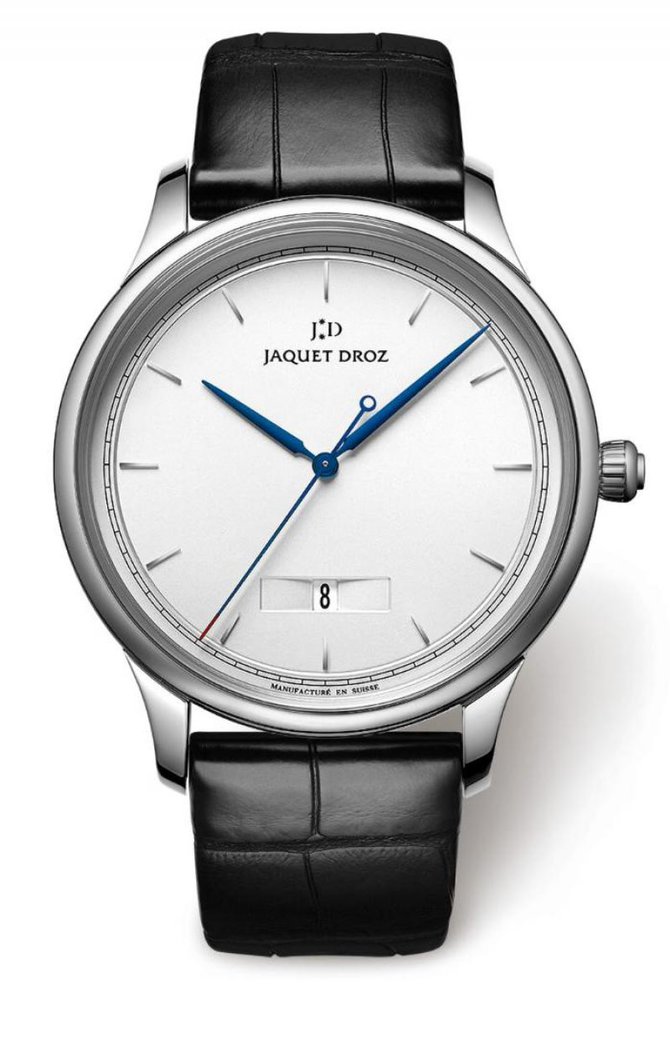 Новинка часового искусства от швейцарской часовой мануфактуры Jaquet Droz - механические наручные часы, которые приводит в действие механизм с автоподзаводом, Калибр Jaquet Droz 1150P, стоящий на 28 драгоценных камнях и обладающий балансовым колесом, частотой баланса - 28 800 полуколебаний в час, запасом хода - 68 часов, двумя заводными барабанами и уникальным скелетонизированным ротором автоматического подзавода. На стильном минималистическом циферблате часов указываются часы, минуты, секунды и дата. Цифры отсутствуют, их заменяют часовые метки. Выпущены две версии модели - с синим циферблатом и синим ремешком из натуральной кожи аллигатора со стальной пряжкой и с серебристым циферблатом и черным ремешком из натуральной кожи аллигатора со стальной пряжкой. Циферблат синего цвета декорирован "женевскими волнами". Новая модель Grande Heure Minute Quantiéme вошла в коллекцию Astrale. Корпус часов выполнен из нержавеющей стали. Диаметр корпуса с синим циферблатом и синим ремнем - 43 миллиметра; диаметр корпуса с серебристым циферблатом и черным ремнем - 39 миллиметров. Толщина обоих корпусов - 11.1 миллиметров. На лицевой и задней сторонах корпуса установлено сапфировое стекло.