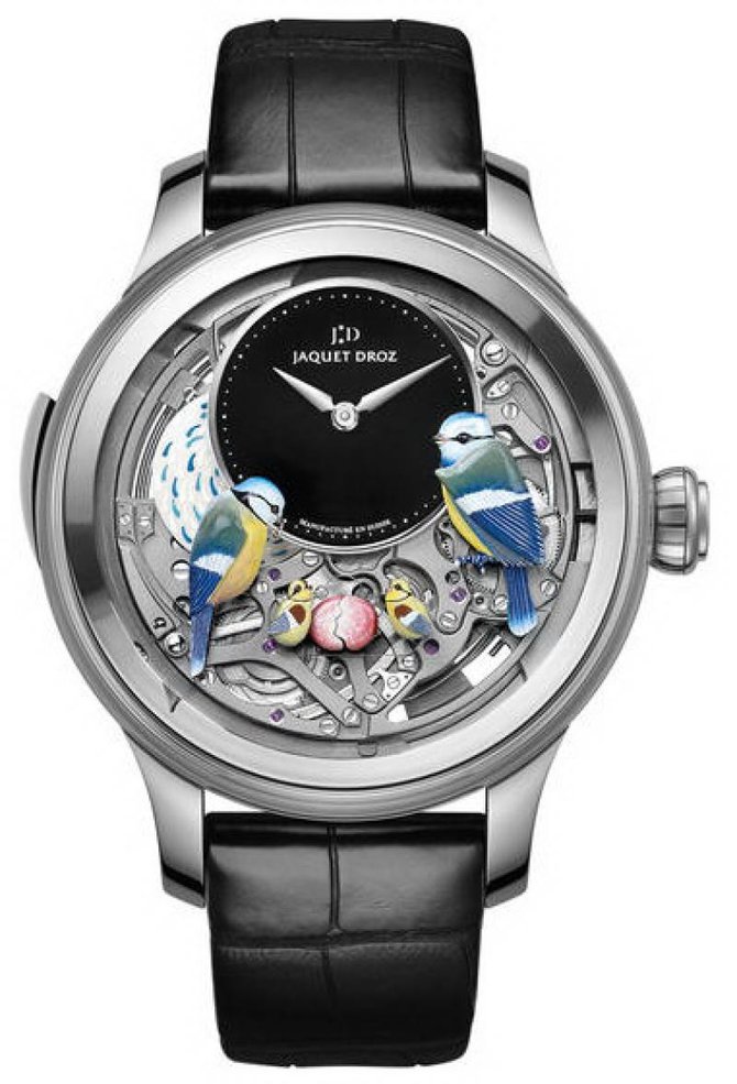 Новинка 2014 года! Часы Bird Repeater Openwork - это сложная комбинация работы мастеров бренда Jaquet Droz при подготовке данной модели, а именно художественного оформления циферблата и инновационных технологий швейцарского часового дома Jaquet Droz. Часы обладают корпусом округлой формы, произведенным из высококачественного белого золота, тщательно отполированным. Размеры корпуса: диаметр - 47,0 мм, толщиной 18,4 мм. С левой стороны корпуса расположен рычаг запуска репетира. С обеих сторон корпуса механизм защищен сапфировым стеклом. Циферблат модели изготавливался с применением гравировки, эмалировки, оникса и перламутра. При срабатывании репетира, начинают работать 8 разнообразных механизмов анимационного характера, синхронная деятельность которых движет головы и крылья птиц, движет птенцов и яйца, находящиеся в гнезде. Также проточная вода начинает блестеть. Стрелки часов произведены из белого золота, Механизм часов с ручным заводом (RMA88), обладает 69 камнями, частотой 18 000 пк в час, запасом хода - 48 часов. Циферблат производит индикацию часов и минут. Комплектуются черным ремешком из кожи крокодила с пряжкой из белого золота. Серия ограничена - 8 экземпляров.