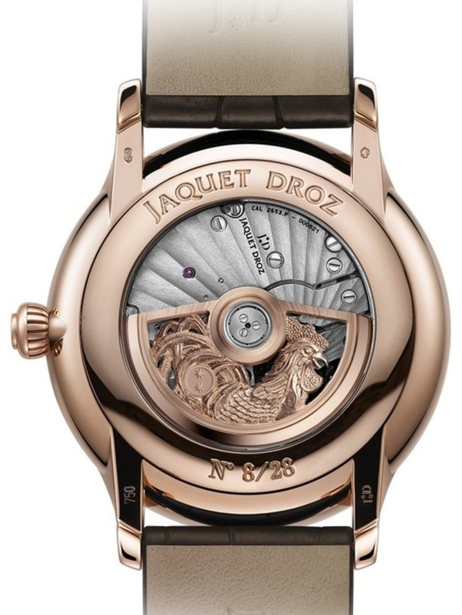Модель от Jaquet Droz выпущена ограниченной серией из 28 экземпляров в честь года Петуха по китайскому календарю, на который припал 2017 год. На белом циферблате изображен мотив петуха на природе, а выше размещены золотые стрелки для индикации часов и минут. Художественный циферблат защищен сапфировым стеклом с антибликовым покрытием. Ремешок пошит из кожи аллигатора с тиснением, который дополнен классической пряжкой из розового золота. Корпус, имеющий 30-метровую водостойкость, также сделан из розового золота. Механизм, что установлен в данной версии часов, калибр Jaquet Droz 2653.P имеет 68 часов запаса хода. Существует версия Petite Heure Minute Rooster с инкрустацией бриллиантами.