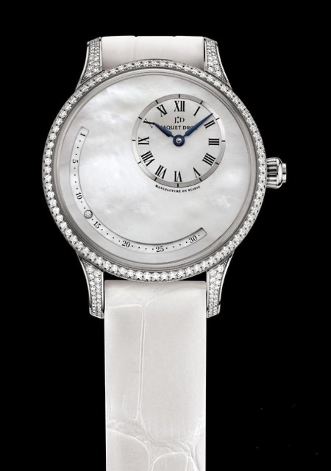 Компания Jaquet Droz выпустила лимитированную серию женских часов Elegance Paris Mother of Pearl Limited Edition 8, в количестве 8-ми экземпляров. Корпус модели из 18-ти каратного белого золота инкрустирован 249-ю белыми бриллиантами, белоснежный жемчужный циферблат и ремешок из кожи аллигатора с вставкой из, того же, белого золота. Механизм автоматический, калибр Jaquet Droz 2650R, водонепроницаемость до 30м и запас хода 68 часов.