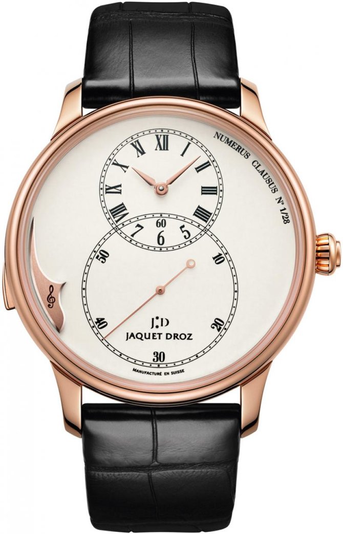 Новая модель вышла ограниченной серией из 28 экземпляров в полированном корпусе из розового золота, в который помещен механизм с автоподзаводом, репетиром и двухсуточным запасом хода. Циферблат эмалированный. В комплекте полагается ремешок из кожи крокодила черного цвета с классической золотой пряжкой. Часы с репетиром: позолоченный металл, цилиндровый спуск, завод часового механизма и механизма боя производится посредством двух золотых роторов, расположенных на задней крышке платины. Только часовые мастера Jaquet-Droz специализировались на создании часов с репетиром, механизм боя которых, как и основной механизм, заводился при помощи груза. На пороге третьего тысячелетия фирма Montres Jaquet Droz SA вошла в состав Swatch Group, что послужило для нее новым толчком к развитию. Первым проявлением этого стал выпуск модели Grande Seconde культовых часов, всецело воплощающих эстетические традиции часового Дома. Представленная в 2002 году модель, на создание которой мастеров вдохновили легендарные часы 1785 года, воплотила в себе саму философию бренда Jaquet Droz и его особое видение не только времени, но и отражающего его ход механизма.