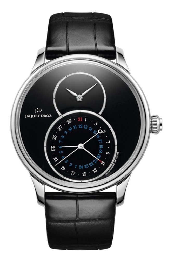 В круглый корпус из нержавеющей стели, диаметром 43 мм, помещен мануфактурный механизм Jaquet Droz 2663H24 с функцией GMT. Черный циферблат, условно поделенный на 2 зоны в виде восьмерки, служит для индикации часов, минут, секунд, даты, времени второго часового пояса. Накрывается циферблат от повреждений сапфировым стеклом. Заводная головка рифленая. Ремешок из кожи аллигатора и классическая застежка - в комплекте. Задняя крышка из сапфирового стекла способствует обзору функционирования механизма. Толщина стального корпуса - 13.13 мм. Механизм отличается 65-часовым уровнем запаса хода. Корпус с герметичностью в 30 метров. Механизм, корпус, ремешок и т.д. - все изготовлено мастерами мануфактуры Jaquet Droz. Дата указывается стрелкой с красным наконечником. К особенностям калибра 2663H24 также стоит отнести кремниевый спуск, благодаря которому обеспечивается хронометрическая точность механизма и устойчивость к воздействию магнитных полей. Обратите внимание, что существует версия модели с белым циферблатом (реф. J016030240).