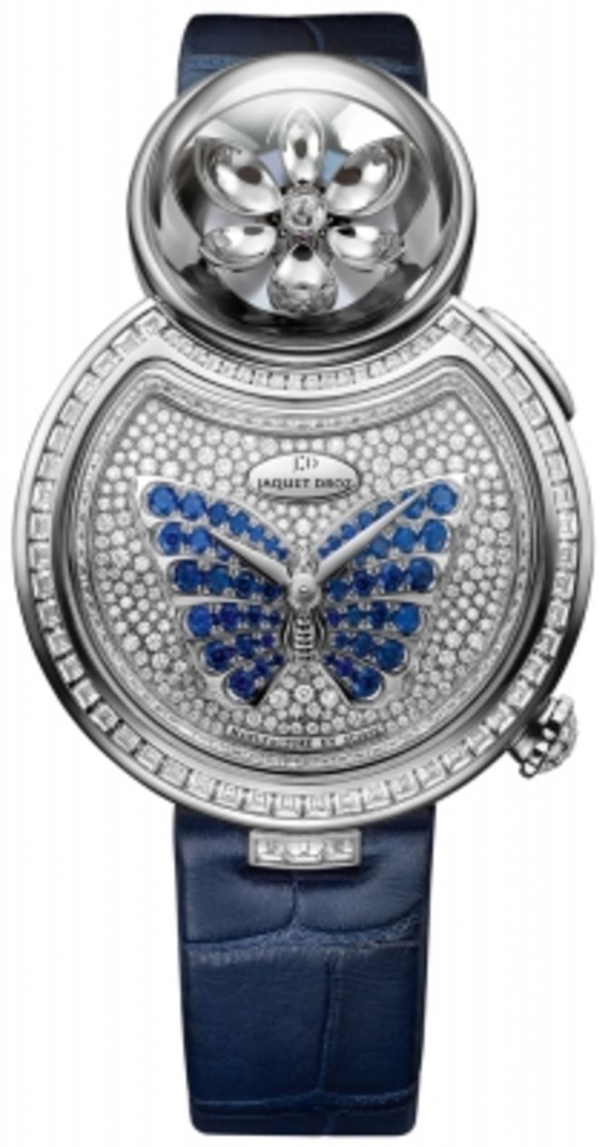 Ювелирные часы представлены компанией Jaquet Droz. Корпус изготовлен из полированного 18-каратного белого золота. Безель инкрустирован 64 багетными бриллиантами. Кроме того, на корпусе и циферблате присутствуют множество бриллиантов как багетной, так и классической огранок. Бабочка на циферблате выложена синими сапфирами. Стрелки для индикации времени сделаны из белого золота. Лимитированный тираж производства - 8 экземпляров. Циферблат перламутровый. Мануфактурный механизм Jaquet Droz Caliber 615 имеет частоту баланса 21 600 пк/час, на 29 драгоценных камнях, с запасом хода 68 часов. Герметичность - 30 метров.