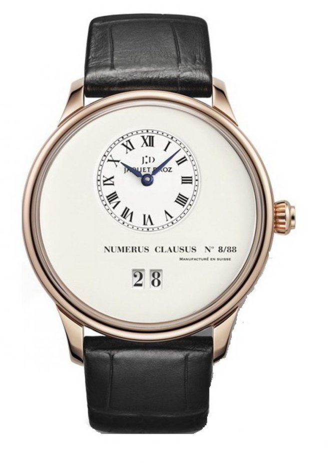 Классическая модель наручных швейцарских часов от знаменитой часовой фирмы Jaquet Droz представлена в корпусе из розового золота, диаметром 43 миллиметра. Герметичность корпуса составляет 30 метров. Часовой механизм, расположенный внутри золотого корпуса, работает от автоматического подзавода, тем самым экономит драгоценное время своего владельца на ручной подзавод. Ремешок, которым укомплектована модель, пошит из кожи аллигатора. Не рекомендуется осуществлять корректировку даты и дня недели между 22:00 и 02:00 часами. При определенных условиях система защиты может помешать осуществлению корректировки в этот период времени.