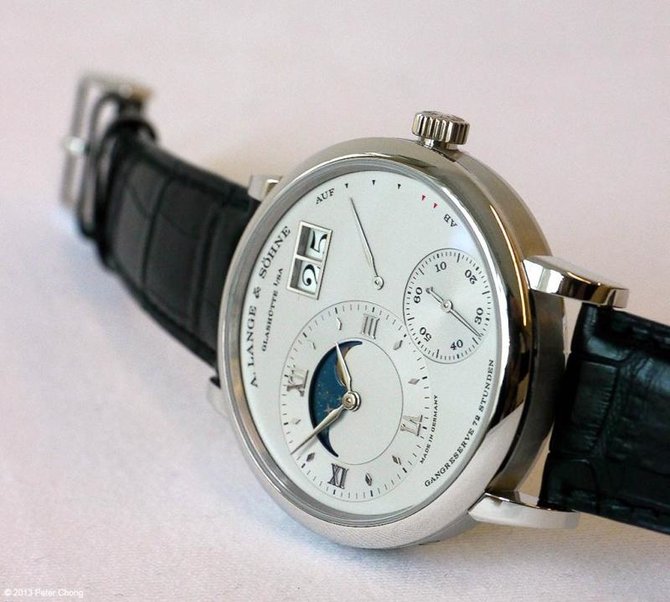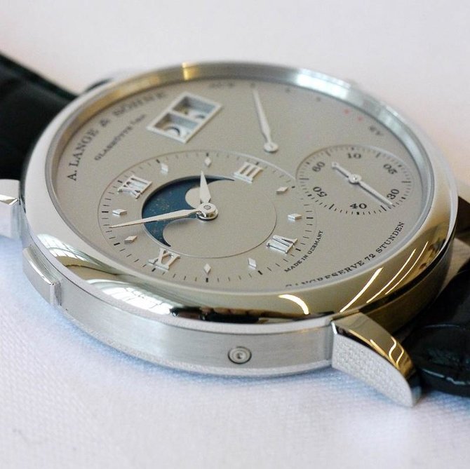 Новинка 2014г. В январе 2014 года в Женеве на международной выставке высокого часового искусства SIHH-2014 (Salon International de la Haute Horlogerie), немецкая часовая компания A. Lange & Söhne официально представит свою новую модель Grand Lange 1 Moon Phase. У новинки круглый полированный корпус, изготовленный 18-каратного розового или желтого золота также будет доступна версия из платины, диаметром 41 мм, толщиной 9,5 мм, водонепроницаемость 30 метров. Рифленая заводная головка расположена на 3 часах. Сапфировое стекло установлено на передней стороне корпуса и на его завинчивающейся задней крышке. Циферблат серебристого цвета, с лучистой отделкой, накладными родироваными золотыми римскими цифрами, индексами и стрелками. Модель оснащена мануфактурным немецким механизмом с ручным заводом A. Lange & Söhne L095.3, собранным вручную, отрегулированным в пяти положениях, на 45 камнях, с балансовой частотой 21600 полуколебаний в час (3 гц), 72-часовым запасом хода, функциями индикации часов, минут (посредством соответствующих стрелок на децентрализованном циферблате, расположенном на 9 часах), секунд (на малом боковом циферблате, расположенном на 5 часах), даты (посредством соответствующих цифровых указателей в двух квадратных апертурах, расположенных на 13 часах), запаса хода (на аналоговом указателе с секторной шкалой, расположенном на 3 часах), а также фаз Луны (посредством соответствующего указателя, расположенная в центре циферблата, расположенного на 9 часах). Поставляется на ремешке из кожи аллигатора с застежкой из платины или 18-каратного розового или желтого золота.