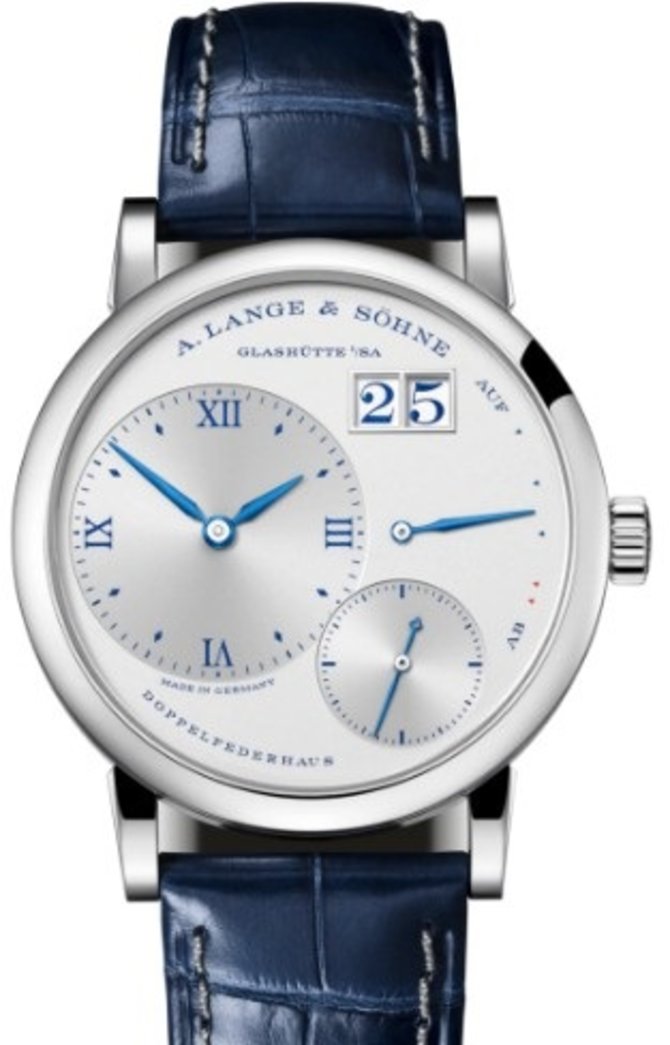 Мужские швейцарские часы A. Lange and Sohne Lange 1 Little Lange 1 25th Anniversary 181.066 с серебристым циферблатом, на котором размещены индикаторы текущего времени, даты и запаса хода, представлены в корпусе из белого 18-каратного золота круглой формы. Выпуклое стекло из сапфирового кристалла служит для защиты циферблата, а противобликовое покрытие гарантирует комфортное считывание данных на солнце. Ремешок часов пошит из кожи аллигатора синего цвета и укомплектован классической застежкой. Механизм L121.1 с ручным подзаводом и запасом хода на 72 часа разработан специалистами марки A. Lange and Sohne. Водонепроницаемость корпуса 30 метров. Часы выпущены в 2019 году ограниченным тиражом 25 экземпляров.
