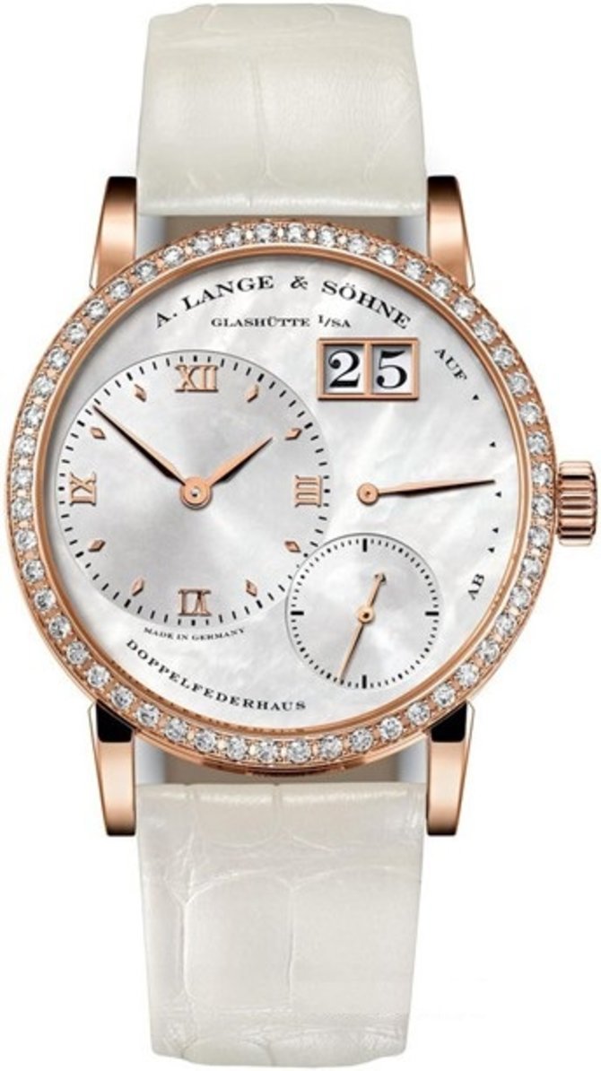 Женская модель наручных швейцарских часов от легендарной часовой мануфактуры A. Lange & Sohne вошла в коллекцию бренда "Little Lange 1". Модель Soiree 36.1mm Ladies Watch представлена в круглом тонком корпусе из розового золота, что украшен белыми бриллиантами в количестве 52 штуки и общим весом +/- 0.8 carats. Циферблат часов выполнен из натурального перламутра. На циферблате указываются часы, минуты, секунды, дата и запас хода механизма. Установленный мануфактурный калибр A. Lange & Sohne Caliber L901.4 с частотой баланса 21 600 пк/в час, состоит из 365 компонентов, имеет 53 драгоценных камня, а также обладает 72-часовым запасом хода. Герметичность корпуса на обыденном уровне - 30 метров. Ремешок из кожи аллигатора и классическая золотая пряжка - в комплекте.