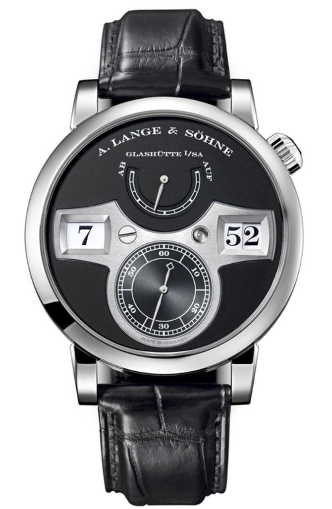 Часы Lange Zeitwerk образовали совершенно новый класс механических часов. Это первые в мире наручные механические часы с цифровой индикацией времени мгновенного переключения. Часовым мастерам Lange удалось разработать и запатентовать совершенно новое устройство цифровой индикации мгновенного переключения с тремя дисками. Zeitwerk помимо видимой простоты восприятия заключают в себе свежее решение временной индикации и сложный часовой механизм скрытый внутри. Индикация часа находится слева, индикация минут - справа, так же очень гармонично смотрятся индикатор запаса хода, расположенный сверху и маленькая секундная стрелка - внизу циферблата. Заводную головку дизайнеры Lange разместили в непривычном месте, она находится в положении на 2 часа, что делает комфортным ощущение часов на руке а также проще стало заводить часы. Наиболее заметный и впечатляющий элемент дизайна - это мост циферблата изготовленный из нейзильбера с родиевым покрытием. На самом деле, мост - это деталь механизма и утопленный подшипник, удерживающий кончик оси указателя минут, доказывает это. Не менее захватывающе часы выглядят с задней стороны. Через прозрачное сапфировое окно задней кришки корпуса, открывается вид на все микромеханическое багатство этого слежнейшего механизма из 388 деталей, калибра L043.1 с ручным заводом и запасом хода 36 часов, на 66 камнях, частота колебаний баланса 18 000пк/час. Наверное самая узнаваемая часть механизма Lange - это вручную гравированный балансовый мост.