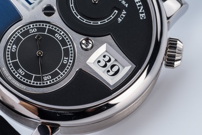 Часы Lange Zeitwerk образовали совершенно новый класс механических часов. Это первые в мире наручные механические часы с цифровой индикацией времени мгновенного переключения. Часовым мастерам Lange удалось разработать и запатентовать совершенно новое устройство цифровой индикации мгновенного переключения с тремя дисками. Zeitwerk помимо видимой простоты восприятия заключают в себе свежее решение временной индикации и сложный часовой механизм скрытый внутри. Индикация часа находится слева, индикация минут - справа, так же очень гармонично смотрятся индикатор запаса хода, расположенный сверху и маленькая секундная стрелка - внизу циферблата. Заводную головку дизайнеры Lange разместили в непривычном месте, она находится в положении на 2 часа, что делает комфортным ощущение часов на руке а также проще стало заводить часы. Наиболее заметный и впечатляющий элемент дизайна - это мост циферблата изготовленный из нейзильбера с родиевым покрытием. На самом деле, мост - это деталь механизма и утопленный подшипник, удерживающий кончик оси указателя минут, доказывает это. Не менее захватывающе часы выглядят с задней стороны. Через прозрачное сапфировое окно задней кришки корпуса, открывается вид на все микромеханическое багатство этого слежнейшего механизма из 388 деталей, калибра L043.1 с ручным заводом и запасом хода 36 часов, на 66 камнях, частота колебаний баланса 18 000пк/час. Наверное самая узнаваемая часть механизма Lange - это вручную гравированный балансовый мост.
