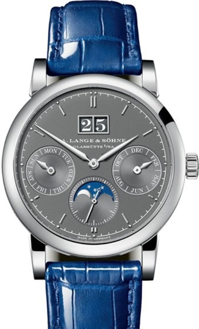 Коллекция Saxonia от компании A. Lange and Sohne пополнилась моделью Annual Calendar 330.039 в корпусе из белого золота, размером 38.5 мм x 9.8 мм. Корпус крепится на руке мягким ремешком синего цвета из кожи аллигатора, который укомплектован классической застежкой из белого золота. Циферблат серого цвета создан в астрономическом стиле - часы, минуты, секунды, дата, день недели, месяц, фаза луны. Материал циферблата - белое золото. Ограниченная серия - 25 штук на весь мир! Внутри корпуса расположили механический мануфактурный калибр L085.1 SAX-0-MAT с запасом хода на 46 часов. Водонепроницаемость корпуса на уровне 30 часов.
