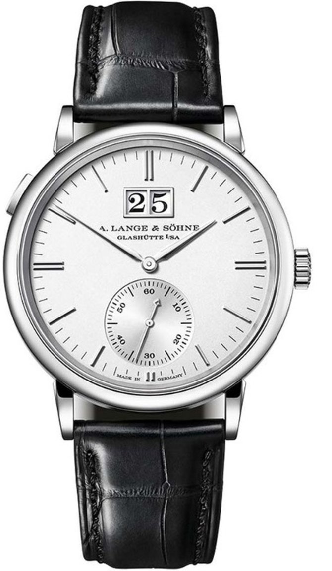Швейцарская часовая марка A. Lange and Sohne выпустила модель Saxonia Outsize Date 381.026 в корпусе круглой формы из белого 18-каратного золота в диаметре 38.5 мм. Расположенный внутри этого корпуса мануфактурный механизм L086.1 имеет возможность работать без подзавода на протяжении 3 суток. Он обеспечивает наручные часы такими функциями: часы, минуты, секунды, дата. Циферблат белого цвета со стрелками и часовой разметкой из белого золота защищен надежным, высокопрочным и противобликовым стеклом из натурального сапфирового кристалла. Престижный производитель A. Lange and Sohne укомплектовал модель Saxonia Outsize Date 381.026 ремнем из кожи аллигатора черного цвета, а также застежкой классического типа из белого золота. К тому же, модель отличается герметичностью корпуса, что гарантирует ему безопасное погружение на глубину до 30 метров.