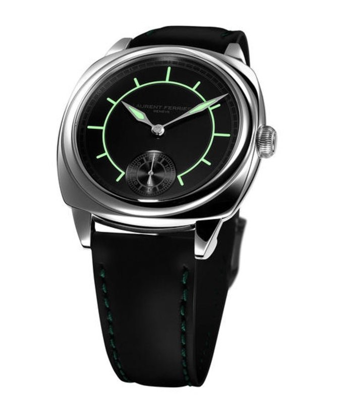 Корпус из тщательно полированной нержавеющей стали, выполненный в форме подушки, хранит в себе мануфактурный швейцарский механизм с автоподзаводом, установленный туда мастерами компании Laurent Ferrier. На циферблате с люминесцентным покрытием, которое светится в темноте, указываются часы и минуты, а на отдельном малом субциферблате размещена секундная стрелка. Толщина корпуса - 11.1 миллиметров, а диаметр - 41 миллиметр. Защитное лицевое стекло - сапфировое, прочнее него считается только алмаз. Ремешок из кожи теленка с зеленой строчкой и классической пряжкой - в комплекте. Часы выпущены в 2016 году. Водонепроницаемость корпуса - 30 метров.