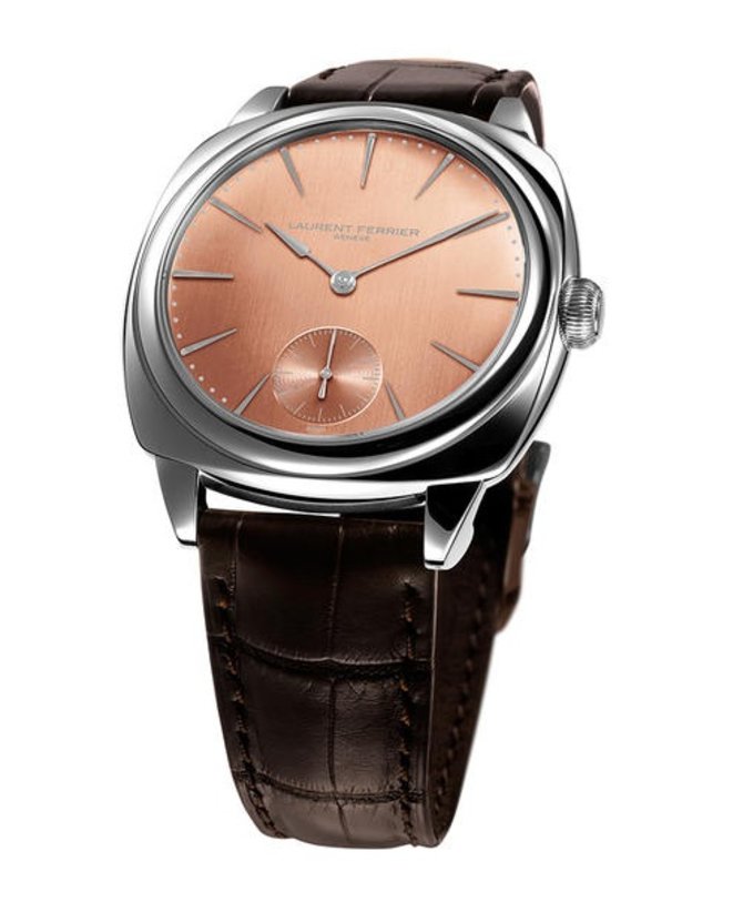 Корпус из тщательно полированной нержавеющей стали, выполненный в форме подушки, хранит в себе мануфактурный швейцарский механизм с автоподзаводом, установленный туда мастерами компании Laurent Ferrier. На основном циферблате указываются часы и минуты, а на отдельном малом субциферблате размещена секундная стрелка. Толщина корпуса - 11.1 миллиметров, а диаметр - 41 х 41 мм. Защитное лицевое стекло - сапфировое (прочнее него считается только алмаз). Ремешок из кожи аллигатора, прошитый вручную, оснащен классической пряжкой из стали. Часы выпущены в 2015 году. Водонепроницаемость корпуса - 30 метров.