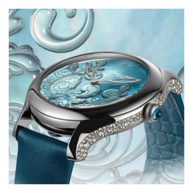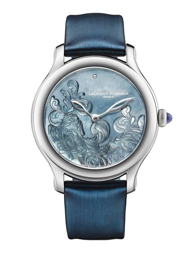 Великолепная женская модель швейцарских часов Lady F, представленная часовой маркой Laurent Ferrier, имеет оригинальный циферблат из натурального морского перламутра. На циферблате размещены центральные скелетонизированные стрелки (часовая и минутная), а также бриллиант вместо метки "12 часов". Корпус модели выполнен из белого золота. Диаметр - 39 миллиметров. Боковые стенки корпуса украшены бриллиантами. Часы оснащены мануфактурным механизмом с микро-ротором автоподзавода. Комплектуются часы атласным ремешком голубого цвета.