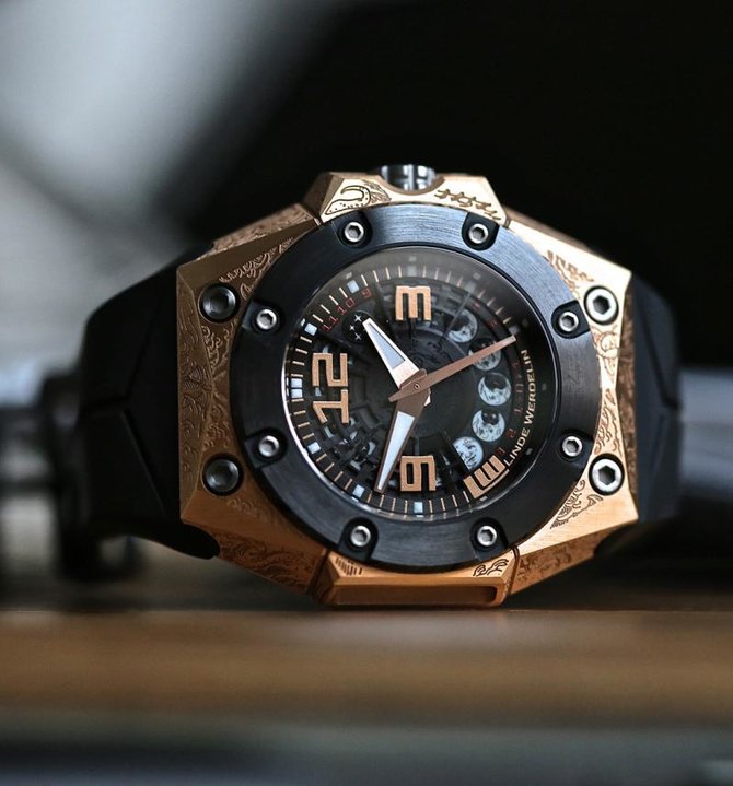 Серия производства этих часов ограничена 59 экземплярами. Корпус, в который помещен автоматический механизм на 23 драгоценных камнях, изготовлен из 18-каратного розового золота. Размеры корпуса таковы: 44 х 46 х 15 мм. Герметичность (водонепроницаемость) корпуса - 300 метров. Ремешок, которым укомплектована модель, изготовлен по специальному заказу Linde Werdelin из натурального каучука. У бренда сохраняется возможность разнообразить модельный ряд за счет игры с цветом, фактурой и материалами. Именно это дает возможность дизайнерам марки добиваться совершенно неожиданных эффектов. Сегодня Linde Werdelin получили возможность еще больше расширить свой модельный ряд и клиентскую базу. Можно отметить, что рынок уже давно был готов к такому событию. Кажется, это именно тот случай, когда размер имеет значение. 44 миллиметра на 46 миллиметров все же многовато для узкого запястья. Linde Werdelin - часы для тех, кто проникся философией жизни от бренда. Несомненно, с годами поклонников и поклонниц у марки будет только прибавляться. Linde Werdelin всегда сохраняют свой стиль и уникальный дизайн.