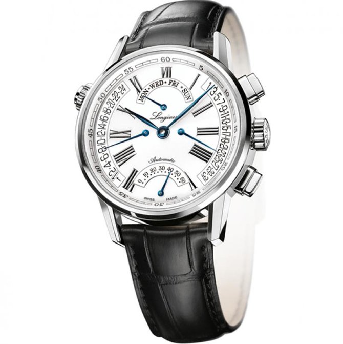 Сегодня, Longines сочетает оригинальную эстетику своих самых заметных исторических моделей с самыми современными технологиями часового дела. Изделия Heritage представляют собой дань уважения духу первопроходцев, который воодушевляет Longines с момента своего создания. Марка сопровождала множество пионеров как в воздухе, так на земле и под водой. Хронометры Longines черпают свою суть из этого опыта. Они иллюстрируют непреходящий характер марки, а также беспрестанно обновляемую способность чтить Историю, с утонченностью и элегантностью. Среди эксклюзивных изделий этого столпа Наследия, без сомнения самыми известными являются часы Lindbergh Hour Angle Watch, новое издание часов, разработанных для американского пилота Чарльза Линдберга в 1931 году. Longines Weems Second-Setting Watch, которые отдают дань навигационной системе Филиппа ван Хорн Вимса, как и Longines Twenty-Four Hours, новое издание часов, разработанных в 1950-е годы специально для пилотов компании Swissair, также фигурируют среди эмблематических моделей Heritage. Эти неповторимые часы представлены в корпусе круглой формы из нержавеющей стали. Имеют сапфировое стекло, устойчивое к царапинам с многослойным антибликовым покрытием изнутри. Водонепроницаемость данной модели до 3 бар(30 метров). Оснащены механическим механизмом с автоматическим подзаводом и четырьмя ретроградными индикаторами, частота 28 800 полуколебаний в час, запас хода 48 часов, калибра L698. Браслет выполнен из кожи аллигатора. Застежка тройная с системой блокировки и кнопкой.