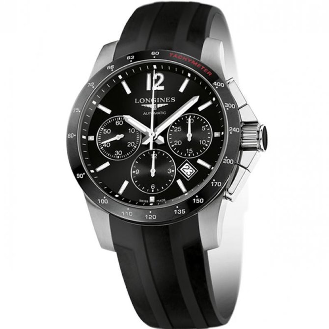 Longines Conquest воплощает в себе квинтэссенцию спортивной элегантности марки. Особое внимание было уделено форме люнета, заводной головки с кабошоном, а также звеньев браслета, выполненных из керамики. Этот исключительный материал сочетает неподдающееся времени очарование с абсолютно новыми техническими свойствами. Изящное сочетание стали и керамики, эффективности и элегантности, часы Longines Conquest обладают всеми техническими характеристиками, необходимыми для удовлетворения требований самых взыскательных спортсменов. Утонченная и в то же время технически совершенная, эта модель не останется незамеченной и на самом элитном званом вечере, и на трибунах престижнейших скачек. Эти часы представлены в корпусе круглой формы из нержавеющей стали и черной керамики. Имеют сапфировое стекло, устойчивое к царапинам с многослойным антибликовым покрытием изнутри. Водонепроницаемость данной модели до 5 бар(50 метров). Оснащены механическим механизмом с автоматическим подзаводом и хронографом с колонным колесом, частота 28 800 полуколебаний в час, запас хода 54 часа, калибра L688. Браслет выполнен из каучука. Имеется прозрачная задняя крышка с сапфировым стеклом. Застежка тройная с системой блокировки и кнопкой.