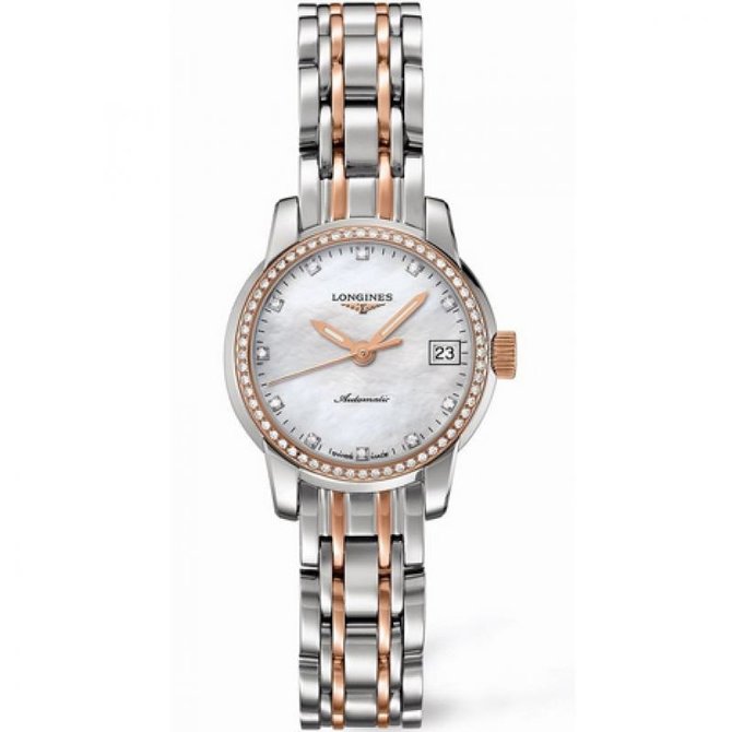 C 1832 года завод часового бренда Longines располагается в Сент-Имье, и на протяжении всей истории бренда его судьба тесно переплеталась с судьбой этого швейцарского городка. Единственная часовая марка, созданная и продолжающая выпускаться в Сент-Имье, Longines остается верной своим историческим ценностям: традиции, элегантность и спорт. Сегодня, запуская коллекцию St.Imier, бренд Longines представляет серию исключительных часов с механическими калибрами, создание которых было вдохновлено богатым наследием часовых мастеров ее родины. Эти часы представлены в корпусе круглой формы из нержавеющей стали и розового золота 18 карат. Корпус украшен 60-ю бриллиантами группы Top Wesselton VVS общим весом 0,174 карата. Имеют сапфировое стекло, устойчивое к царапинам с многослойным антибликовым покрытием изнутри. Водонепроницаемость данной модели до 3 бар(30 метров). Оснащены механическим механизмом с автоматическим подзаводом, частота 28 800 полуколебаний в час, запас хода 40 часов, калибра L595. Циферблат украшен 11-ю бриллиантами группы Top Wesselton VVS общим весом 0,031 карата. Браслет выполнен из нержавеющей стали и розового золота 18 карат. Имеется прозрачная задняя крышка с сапфировым стеклом. Застежка тройная с системой блокировки и кнопкой.