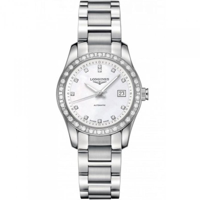 Являясь партнером множества престижных спортивных соревнований, компания Longines создала коллекцию часов, отвечающих волнующей атмосфере этих событий. Как посвящение хронографам, которые выпускаются с 1878 года, знаменитая швейцарская часовая компания представляет коллекцию Conquest Classic. Ее модели отражают ценности, которые исповедует Longines: элегантность, точность, верность традициям. Они оснащаются часовыми механизмами с автоматическим подзаводом и, будучи абсолютно современными, остаются не подвластны времени.Модели Conquest Classic являются официальными часами множества спортивных событий – конных и горнолыжных турниров, соревнований по художественной и спортивной гимнастике, состязаний в стрельбе из лука, чемпионата Ролан Гаррос и Игр Содружества 2014 года в Глазго. Эти часы представлены в корпусе круглой формы из нержавеющей стали. Имеют сапфировое стекло, устойчивое к царапинам с многослойным антибликовым покрытием изнутри. Корпус украшен 30 бриллиантами группы Top Wesselton VVS общим весом 0,501 карата. Водонепроницаемость данной модели до 5 бар(50 метров). Оснащены механическим механизмом с автоматическим подзаводом, частота 28 800 полуколебаний в час, запас хода 40 часов, калибра L595. Браслет выполнен из нержавеющей стали. Циферблат украшен 12-ю бриллиантами группы Top Wesselton VVS общим весом 0,048 карата. Имеется прозрачная задняя крышка с сапфировым стеклом. Застежка тройная с системой блокировки и кнопкой.