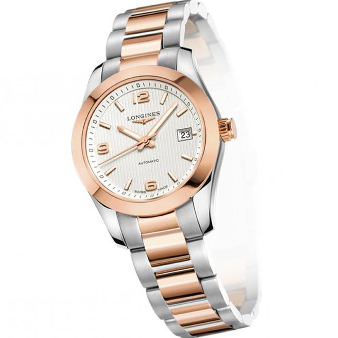 Являясь партнером множества престижных спортивных соревнований, компания Longines создала коллекцию часов, отвечающих волнующей атмосфере этих событий. Как посвящение хронографам, которые выпускаются с 1878 года, знаменитая швейцарская часовая компания представляет коллекцию Conquest Classic. Ее модели отражают ценности, которые исповедует Longines: элегантность, точность, верность традициям. Они оснащаются часовыми механизмами с автоматическим подзаводом и, будучи абсолютно современными, остаются не подвластны времени.Модели Conquest Classic являются официальными часами множества спортивных событий – конных и горнолыжных турниров, соревнований по художественной и спортивной гимнастике, состязаний в стрельбе из лука, чемпионата Ролан Гаррос и Игр Содружества 2014 года в Глазго. Эти часы представлены в корпусе круглой формы из нержавеющей стали и розового золота 18 карат. Имеют сапфировое стекло, устойчивое к царапинам с многослойным антибликовым покрытием изнутри. Корпус украшен 30 бриллиантами группы Top Wesselton VVS общим весом 0,501 карата. Водонепроницаемость данной модели до 5 бар(50 метров). Оснащены механическим механизмом с автоматическим подзаводом, частота 28 800 полуколебаний в час, запас хода 40 часов, калибра L595. Браслет выполнен из нержавеющей стали и розового золота 18 карат. Циферблат украшен 12-ю бриллиантами группы Top Wesselton VVS общим весом 0,048 карата. Имеется прозрачная задняя крышка с сапфировым стеклом. Застежка тройная с системой блокировки и кнопкой.