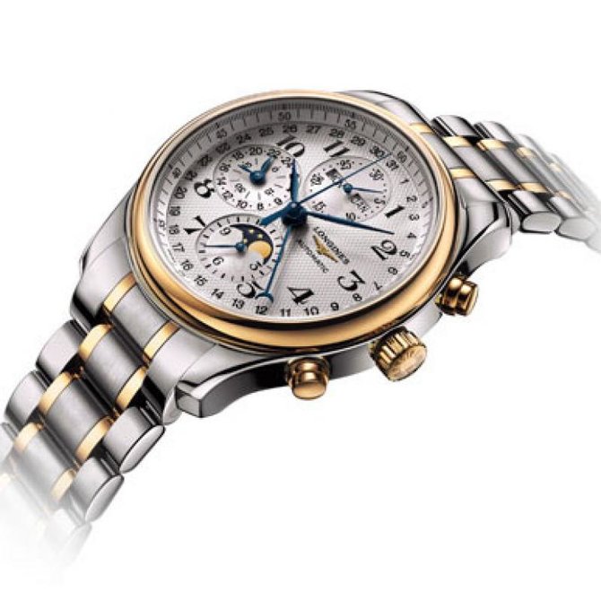 Марка Longines, благодаря многолетними традициями качества, с самого начала своего существования создала безупречную международную репутацию для своих часов, примечательных не только за присущее им высокое качество, но и за стиль и следование модным тенденциям. Это, несомненно, относится и к современным моделям часов с изысканным дизайном, составляющим коллекцию The Longines Master Collection. К основной коллекции, с успехом запущенной в 2005 году, Longines добавляет модели в розовом и желтом золоте, с черным циферблатом и в новом размере, которые уже успели произвести сенсацию на часовом рынке. Они появились ровно тогда, когда покупатели заявили о своем выборе в пользу продукции, которая не только воплощает истинные ценности, но и обладает ярко выраженной индивидуальностью. Эти изумительные часы представлены в корпусе круглой формы из нержавеющей стали и желтого золота 18 карат. Имеют сапфировое стекло, устойчивое к царапинам. Водонепроницаемость данной модели до 3 бар(30 метров). Оснащены механическим механизмом с автоматическим подзаводом, четырьмя ретроградными индикаторами и указателем фаз Луны, частота 28 800 полуколебаний в час, запас хода 48 часов, калибра L678. Браслет выполнен из нержавеющей стали и и желтого золота 18 карат. Прозрачная задняя крышка с сапфировым стеклом. Застежка тройная с системой блокировки и кнопкой.