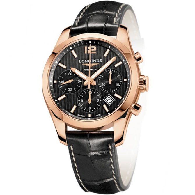 Являясь партнером множества престижных спортивных соревнований, компания Longines создала коллекцию часов, отвечающих волнующей атмосфере этих событий. Как посвящение хронографам, которые выпускаются с 1878 года, знаменитая швейцарская часовая компания представляет коллекцию Conquest Classic. Ее модели отражают ценности, которые исповедует Longines: элегантность, точность, верность традициям. Они оснащаются часовыми механизмами с автоматическим подзаводом и, будучи абсолютно современными, остаются не подвластны времени.Модели Conquest Classic являются официальными часами множества спортивных событий – конных и горнолыжных турниров, соревнований по художественной и спортивной гимнастике, состязаний в стрельбе из лука, чемпионата Ролан Гаррос и Игр Содружества 2014 года в Глазго. Эти часы представлены в корпусе круглой формы из розового золота 18 карат. Имеют сапфировое стекло, устойчивое к царапинам с многослойным антибликовым покрытием изнутри. Водонепроницаемость данной модели до 5 бар(50 метров). Оснащены механическим механизмом с автоматическим подзаводом и хронографом с колонным колесом, частота 28 800 полуколебаний в час, запас хода 54 часа, калибра L688. Браслет выполнен из кожи аллигатора. Имеется прозрачная задняя крышка с сапфировым стеклом. Застежка тройная с системой блокировки и кнопкой.