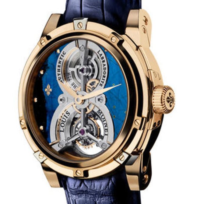 Извесный бренд Louis Moinet представил модель Treasures of the World Labradorite Red Gold с уникальным циферблатом из лабрадорита. Турбийон, что находится на уровне 6-ти часов, объединен с центральной часовой и минутной стрелками. Запас хода механического калибра, что установлен внутри этого круглого корпуса, до 72 часов. Корпус состоит из 50 частей. Он выполнен из розового золота. Задняя крышка прозрачная, из сапфирового кристалла. Ремешок выполнен из кожи аллигатора и оснащен золотой раскладной пряжкой.