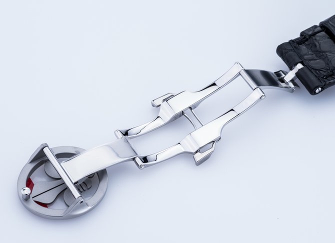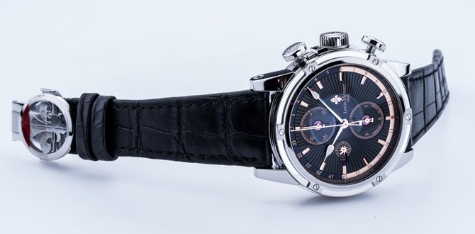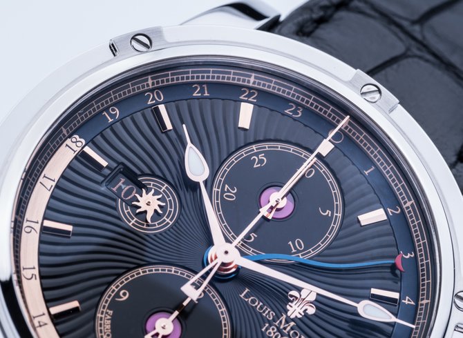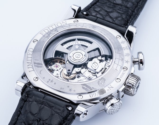 Известная на весь мир французская компания Louis Moinet, которая специализируется на изготовлении великолепных часов, представляет Вашему вниманию очередную модель Часы Louis Moinet Limited Edition Geograph LM-24.10.55. из коллекции Limited Edition. Данная модель будет интересна любителям необычных дизайнов, подчеркивающие классический стиль а также функциональных устройств. Корпус круглой формы отполирован до блеска, выполнен из нержавеющей стали, его размер составляет 45.5 х 17.07 мм. Основные функции часов это часы, минуты, секунды, дата, индикатор день/ночь. Часы оснащены функцией двойного времени и хронографом. Механизм с автоматическим заводом имеет запас хода на 48 часов. Циферблат часов черного цвета, гильошированный. Ремешок часов выполнен из кожи аллигатора, черного цвета, оснащен вставкой из нержавеющей стали, а также раскладывающейся застежкой. Стрелки которые находятся на циферблате, отлиты вручную из вороненной стали. Прочное сапфировое стекло закрывает корпус, а задняя крышка находится под давлением. Водонепроницаемость модели составляет пятьдесят. Заводной ключ находится на позиции трех часов. Серия данной модели ограничена в 60 шт.