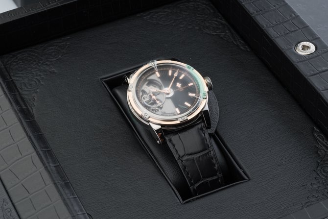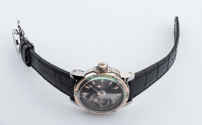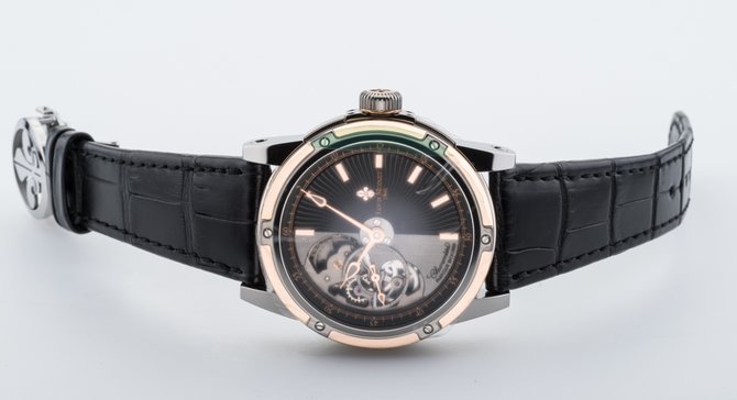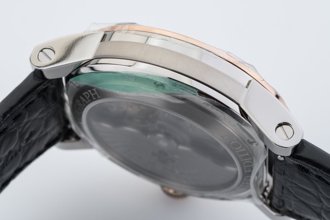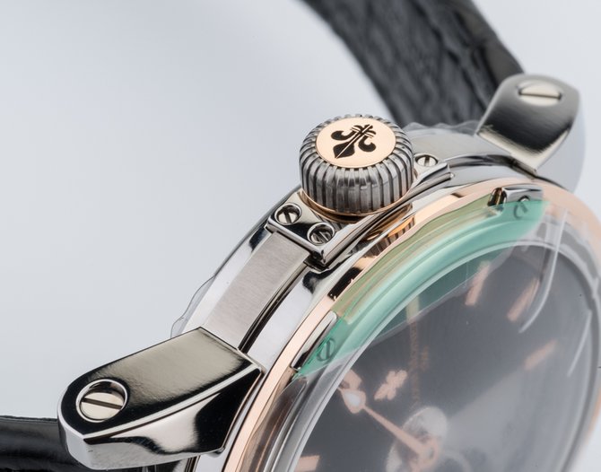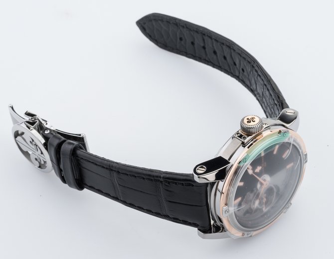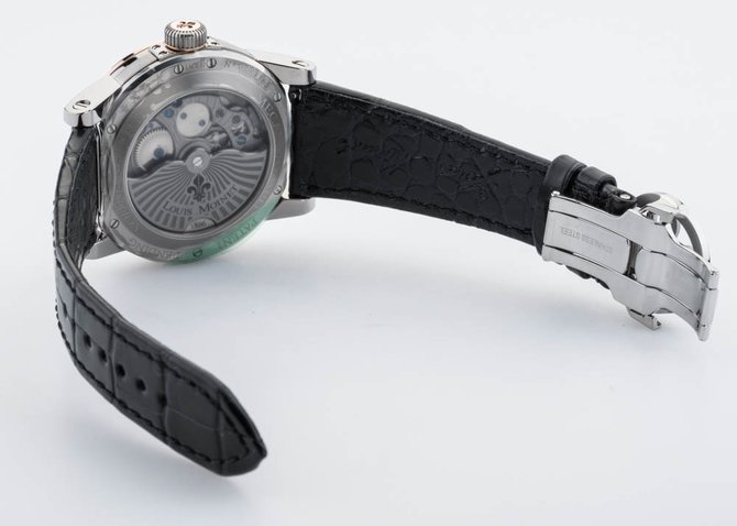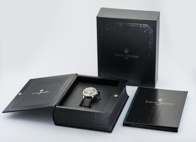Известная на весь мир французская компания Louis Moinet, которая специализируется на изготовлении великолепных часов, представляет Вашему вниманию очередную модель Часы Louis Moinet Limited Edition Mecanograph LM-31.40.55. из коллекции Limited Edition. Данная модель будет интересна любителям необычных дизайнов, подчеркивающие классический стиль а также функциональных устройств. Корпус круглой формы отполирован до блеска, выполнен из титана и розового золота, его размер составляет 43.5 х 15.6 мм. Основные функции часов это часы, минуты, секунды. Часы оснащены функцией хронометра. Механизм с автоматическим заводом имеет запас хода на 48 часов. Циферблат часов черного цвета с серебристым, гильошированный. Ремешок часов выполнен из кожи аллигатора, черного цвета, оснащен вставкой из титана, а также раскладывающейся застежкой. Стрелки которые находятся на циферблате, отлиты вручную из вороненной стали. Прочное сапфировое стекло закрывает корпус, а задняя крышка находится под давлением. Водонепроницаемость модели пятьдесят метров. Заводной ключ находится на позиции трех часов. Серия данной модели ограничена в 365 шт.