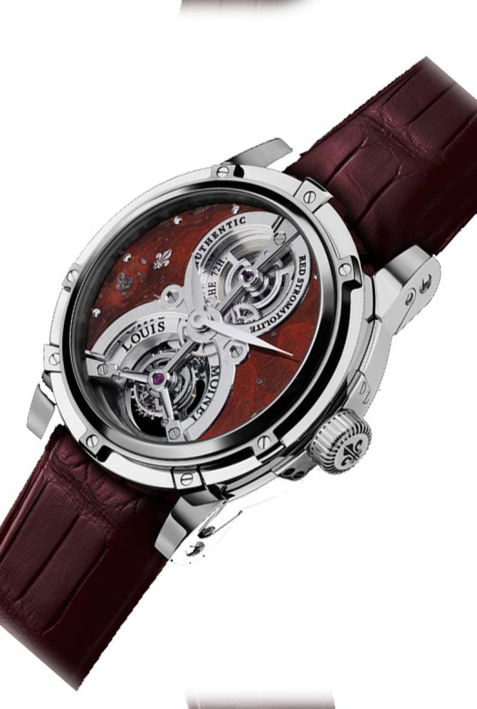Французская компания Louis Moinet, что специализируется на изготовлении высококлассных часов, представляет Вашему вниманию модель Treasures of the World Red Stromatolite WG из коллекции Limited Edition. Корпус отполирован, выполнен из 18 к белого золота, диаметром 47 мм. Основные функции часов - часы, минуты, секунды. К тому же, часы оснащены турбийоном. Механизм с ручным заводом, калибр DW8028, имеет запас хода на 72 часа. Циферблат часов - красный строматолит. Ремешок выполнен из кожи аллигатора в коричневом цвете, со вставкой из розового золота, а также раскладывающейся застежкой в комплекте. Стрелки из вороненной стали выполнены вручную мастерами марки Louis Moinet. Прочное сапфировое стекло защищает корпус с двух сторон. Водонепроницаемость модели - 30 метров. Часы произведены в единственном экземпляре.
