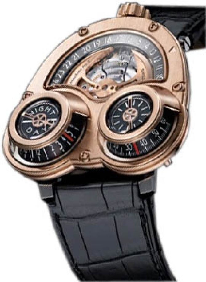 Известная во всем мире компания MB&F, представляет очередную великолепную модель мужских наручных часов, из коллекции Horological Machines (Horological Machine No.3 30.RTL.B). Данная модель поражает воображение о часах нестандартным, неординарным шикарным дизайном. Внимание к данной модели, привлекают трехмерные конусы, которые располагаются на корпусе перпендикулярно или параллельно руке. Конус с индикатором дня и ночи оснащен указателем часов, а второй показывает минуты. Корпус сложной формы комбинированный, отполирован, и выполнен из 18-каратного розового золота и титана. Параметры корпуса: 47 x 50 x 16мм. На золотисто-черном циферблате, великолепно смотрятся вручную отлитые стрелки из вороненной стали. Прочные стекла, устойчивые к царапинам и другим повреждениям выполненные из сапфира, закрывают корпус часов с обеих сторон. Ремешок черного цвета, сделан из кожи аллигатора, оснащен раскладывающейся застежкой, а также вставкой из 18-каратного розового золота. Водостойкость модели составляет 100 футов, что равняется 30 метрам.