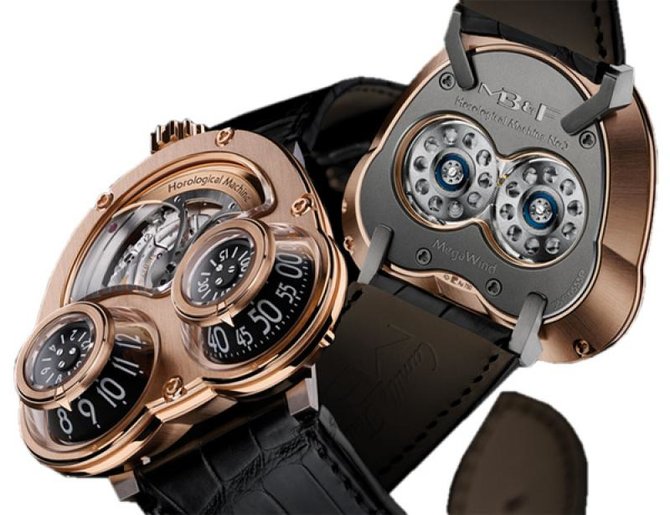 Известная во всем мире компания MB&F, представляет очередную великолепную модель мужских наручных часов, из коллекции Horological Machines (Horological Machine No.3 31.RTL.B). Данная модель поражает воображение о часах нестандартным, неординарным шикарным дизайном. Внимание к данной модели, привлекают трехмерные конусы, которые располагаются на корпусе перпендикулярно или параллельно руке. Конус с индикатором дня и ночи оснащен указателем часов, а второй показывает минуты. Корпус сложной формы комбинированный, отполирован, и выполнен из 18-каратного розового золота и титана. Параметры корпуса: 47 x 50 x 16мм. На золотисто-черном циферблате, великолепно смотрятся вручную отлитые стрелки из вороненной стали. Прочные стекла, устойчивые к царапинам и другим повреждениям выполненные из сапфира, закрывают корпус часов с обеих сторон. Ремешок черного цвета, сделан из кожи аллигатора, оснащен раскладывающейся застежкой, а также вставкой из 18-каратного розового золота. Водостойкость модели составляет 100 футов, что равняется 30 метрам.