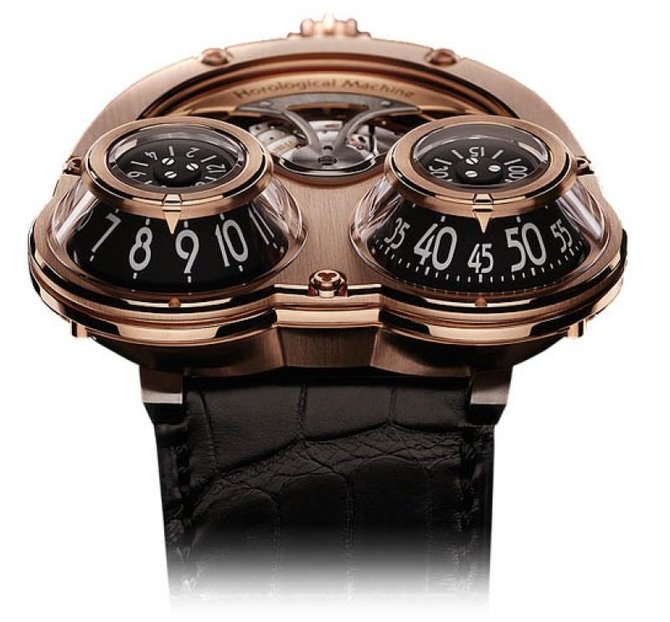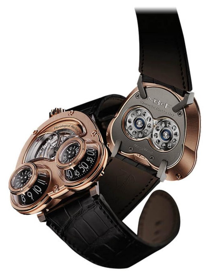Один из ярчайших представителей современного высокого часового искусства Максимилиан Бюссер представил новую версию своей "Машины Времени" - Horological Machine No.3 Megawind. В основе лежит тот же принцип, что и в самой первой модели линейки. На корпусе расположены два трехмерных конуса: первый имеет указатель часов, а второй показывает минуты. Показания часов и минут передаются при помощи керамических шарикоподшипников к стрелкам, изготовленным методом лазерной обработки. Через отверстие в верхней части корпуса можно полюбоваться перевернутым механизмом, окруженным полукруглой шкалой указателя даты. Часы представлены в двух версиях, в корпусе из белого золота и титана или розового золота и титана. Одна из самых выразительных деталей механизма - ротор автоподзавода голубого цвета.
