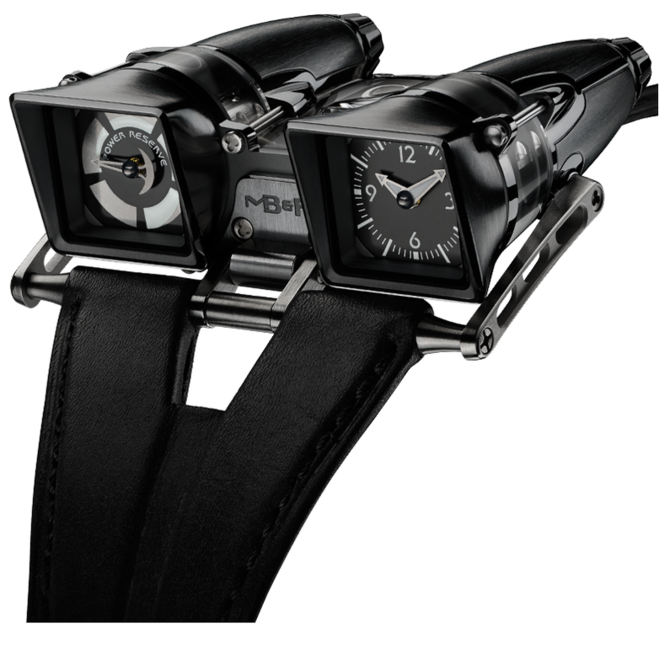 Неформальный корпус часов изготовлен из титана с черным покрытием PVD. Габариты корпуса: 54 х 52 (диаметр) х 24 (толщина) мм. Автоматический мануфактурный механических калибр от MB&F гарантирует индикацию главного - текущего времени, а также полезным помощником станет индикатор уровня запаса хода. Ремешок черного цвета из натуральной кожи теленка, которым укомплектованы часы - результат ручной работы мастера. Раскладывающаяся застежка изготовлена из титана. Модель была представлена брендом MB&F в 2013 году.