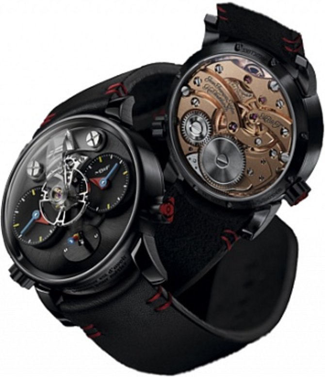 Модель LM1 Silberstein Black, представленная часовой компанией MB&F, функционирует на механическом механизме с ручным подзаводом мануфактурного производства MB&F, заключенном в круглый 40-миллиметровый корпус из высококачественного титана с PVD-покрытием. Модель с индикацией часов, минут и уровня запаса хода часового механизма. Также индицируется время второго часового пояса. Толщина корпуса - 17 мм. Сапфировое стекло оберегает часы с двух сторон - лицевой и задней. Герметичность корпуса - 30 метров. Ремешок черного цвета с красной строчкой пошит из натуральной телячьей кожи. Застежка титановая, классического типа. Герметичность корпуса не высокая - 30 метров. Часы выпущены ограниченной серией из 12 экземпляров. Механизм имеет 45-часовой запас хода.