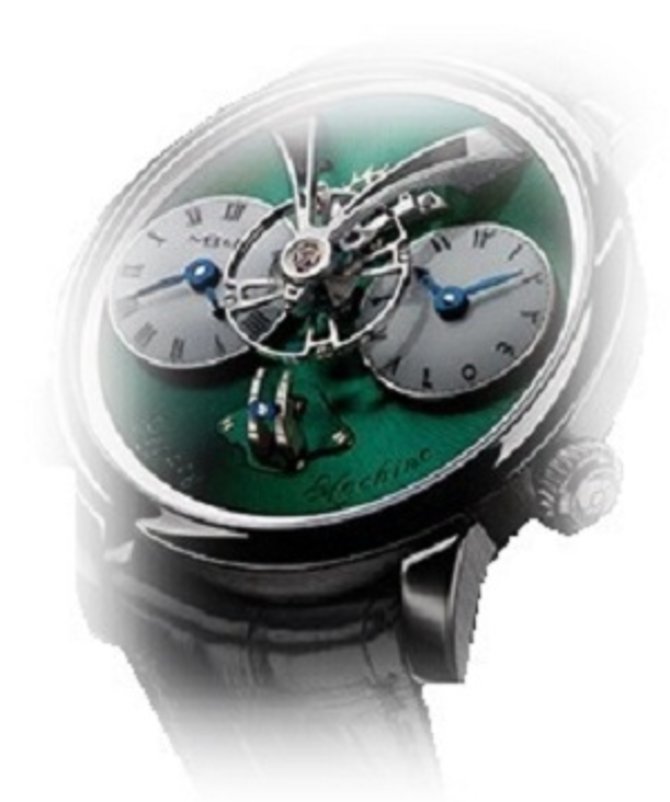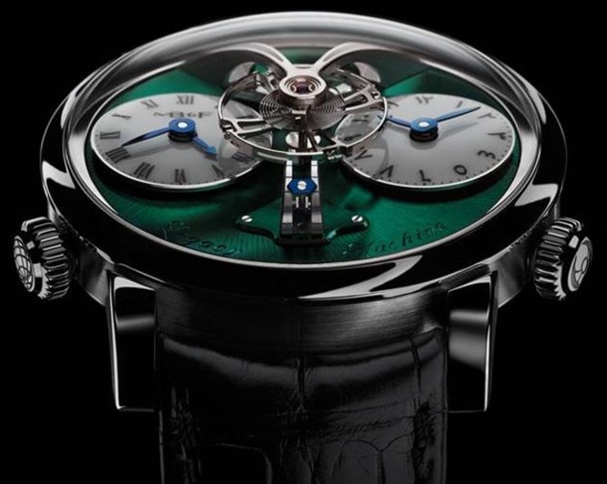 Сложные швейцарские часы MB&F Legacy Machine No1 M.A.D. Dubai обладают функцией индикации второго времени - просто необходимым дополнением к повседневным наручным часам для любителей путешествий. Круглый часовой корпус модели для путешественников выполнен из высококачественной нержавеющей стали. Диаметр корпуса - 44 мм, толщина - 16 мм. На примечательном циферблате зеленого цвета указываются часы, минуты и уровень запаса хода механизма, который в данной модели равен 45 часам. Дополнением элегантности к строгому стилю швейцарских часов станет крокодиловый ремешок черного цвета и классическая стальная застежка. Накрывается циферблат выпуклым сапфировым стеклом. Корпус с 30-метровым уровнем герметичности. Ограниченный тираж версии часов MB&F Legacy Machine No1 M.A.D. Dubai - 13 экземпляров. Стоит отметить, что представленная модель выпущена в честь салона MB&F M.A.D.Gallery, который открылся в популярном туристическом городе Объединённых Арабских Эмиратов - Дубайе.