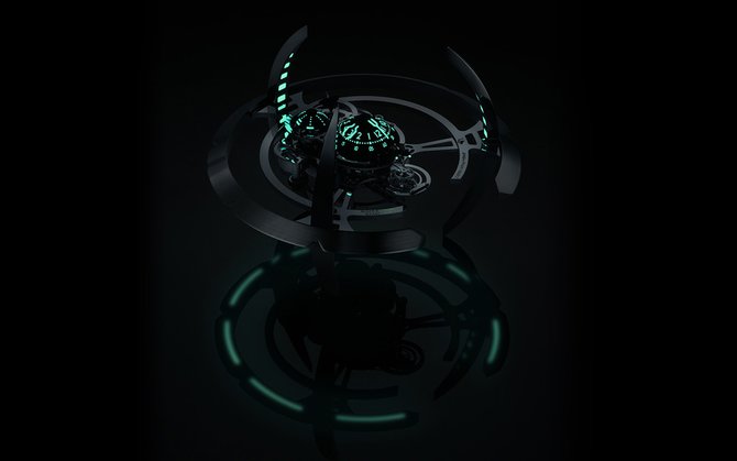 Настольные швейцарские часы MB&FPerfomance Art Starfleet Machine Black Badger Radar Green украсят стол представителей любого пола. Крупный корпус сложной формы, диаметром 290.00 х 210.00 мм, изготовлен из палладия. Циферблат защищается натуральным сапфировым стеклом. Внутри палладиевого корпуса расположен механизм с ручным подзаводом, обладающий огромным уровнем запаса хода - 960 часов. Индикация данных: часы, минуты, уровень запаса хода. Ограниченный тираж - 18 экземпляров. Рекомендованная производителем стоимость - 33 000 CHF. Часы разработаны брендом MB&F совместно с компанией L’Epee. Часы имеют противоударную систему Incabloc.