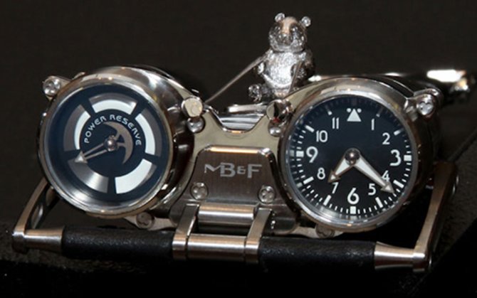 Эти швейцарские часы выпущены мануфактурой MB&F в единственном на весь мир экземпляре! Корпус модели, на котором размещены 2 циферблата, выполнен из белого золота. Он достаточно внушительного размера: 54 x 52 х 24 мм. Циферблаты покрыты сапфировым стеклом. В комплекте - кожаный ремешок. Застежка раскладывающегося типа. Индикация: часы и минуты на правом циферблате, индикатор запаса хода — на левом. Также на корпусе присутствует съемная фигурка панды, выполненная из белого золота. Модель разработана совместно с художником из Китая по имени Huang Hankang. Часы были представлены в 2011 году на аукционе Only Watch. О механизме можно сказать, что он состоит из 311 элементов, с балансовой частотой 21600 полуколебаний в час (3 гц) и на 50 драгоценных камнях. Функционирует модель от ручного подзавода.