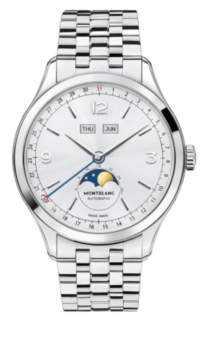 Представленная модель отображает данные календаря, включая дату, день недели, месяц и фазы Луны на серебристо-белом циферблате с узором "солнечные лучи". Швейцарская марка Montblanc в модели Heritage Chronométrie Quantième Complet объединила важный функциональный календарь элегантным внешним видом швейцарской разработки. Как корпус, так и браслет выполнены из нержавеющей стали, полированной вручную мастерами Montblanc. Стекло, которым накрывается астрономический циферблат, произведено из сапфирового кристалла с антибликовыми свойствами. Диаметр корпуса - 40 мм. За высокую функциональность отвечает установленный часовой калибр MB 29.16 мануфактурной работы инженеров Montblanc.