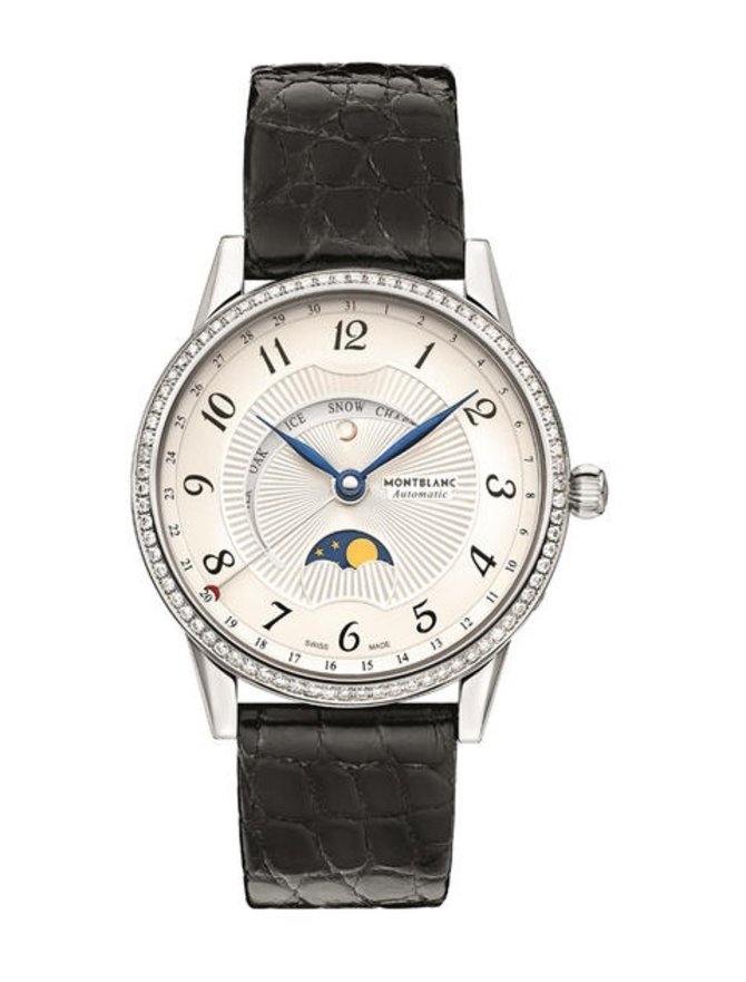 Женские астрономические швейцарские часы Montblanc Bohème Moongarden выполнены в корпусе из нержавеющей стали, диаметром 36 миллиметров. Безель украшен бриллиантами. Основные функции модели - часы, минуты, дата, фазы Луны. В часах установлен швейцарский мануфактурный механизм с автоподзаводом от часовой компании Montblanc. Стекло сапфировое. Ремешок из кожи аллигатора. Застежка стальная, классическая. Год выпуска представленных швейцарских часов - 2015. Водостойкость корпуса - 30 метров.