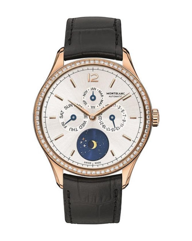 Швейцарские часы Montblanc Chronomètrie Quantième Annuel Vasco Da Gama Limited Edition 90 выполнены в корпусе из розового золота, диаметром 40 миллиметров. Безель украшен бриллиантами. Основные функции модели - часы, минуты, день недели, месяц, дата, фазы Луны. В часах стоит швейцарский мануфактурный механизм с автоподзаводом от Montblanc. Стекло сапфировое. Ремешок из кожи аллигатора. Застежка из розового золота, классическая. Год выпуска представленных швейцарских часов - 2015. Лимитированный тираж - 90 экземпляров. Водостойкость корпуса - 30 метров.