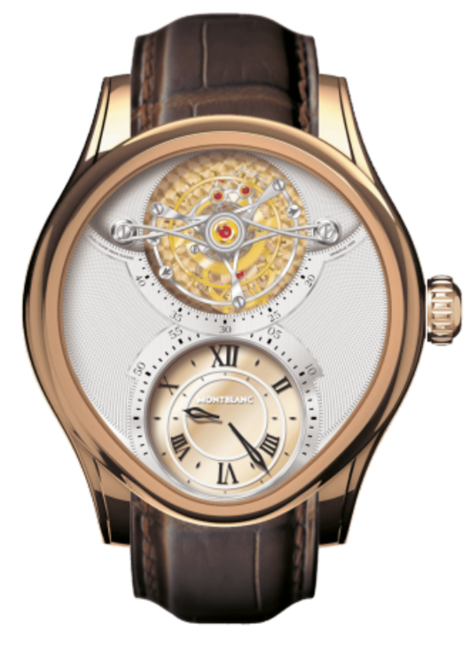 Наручные часы Grand Tourbillon Heures Mystérieuses от Montblanc уникальны. Их верхняя половина функционирует как окно циферблата, в котором можно увидеть крупный турбийон, что вращается полностью вокруг своей собственной оси через минуту; он компенсирует позиционную ошибку, которая отрицательно влияет на точность движения, когда часы находятся в вертикальном положении. Непосредственно ниже этого механизма используется другая важная особенность часов - отображение времени. Кажется, что стрелки скользят в воздухе, без видимых средств движения. Они тиснены на вращающихся стеклянных дисках, управляемых механизмами, скрытыми за циферблатом. Диски часов Montblanc настроены против зеркального фона, создавая увлекательную иллюзию трехмерности.