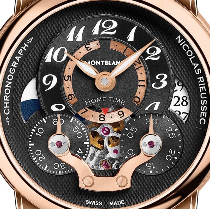 Предлагаемые Montbalnc хронографы Nicolas Rieussec не только воздают дань уважения знаменитому часовому мастеру, но и позволяют по достоинству оценить революционное нововведение Николя Риуссека: диски секундного и минутного счётчиков вращающиеся под неподвижными стрелками. В модели Open Hometime в круглых апертурах на часовой шкале, смещённого относительно центра циферблата текущего времени с помощью частично скелетизированного двенадцатичасового вращающегося диска отображается время во втором часовом поясе. При создании данной системы предпочтение было отдано индикации с помощью вращающегося диска. Сложное взаимодействие трёх вращающихся дисков в часах, где циферблат является неотъемлемой частью механизма, представляет собой интересное техническое решение, которое легло в основу узнаваемого с первого взгляда оформления.