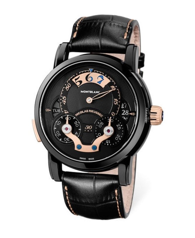 Швейцарская часовая мануфактура Montblanc этой моделью наручных часов в 2013 году пополнила свою коллекцию "NICOLAS RIEUSSEC". Корпус часов выполнен из стали с DLC-покрытием. Его диаметр - 43 мм. Основные функции: часы, минуты, день недели, дата, индикатор день/ночь, хронограф. Защитное лицевое стекло - сапфировое. Швейцарский механизм мануфактурного производства Montblanc работает от автоматического подзавода. Ремешок к модели пошит из кожи луизианского крокодила. Классическая застежка сделана из розового золота. Водонепроницаемость корпуса - 30 метров.